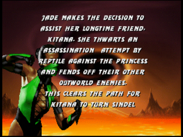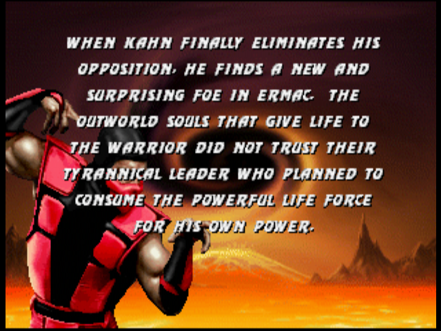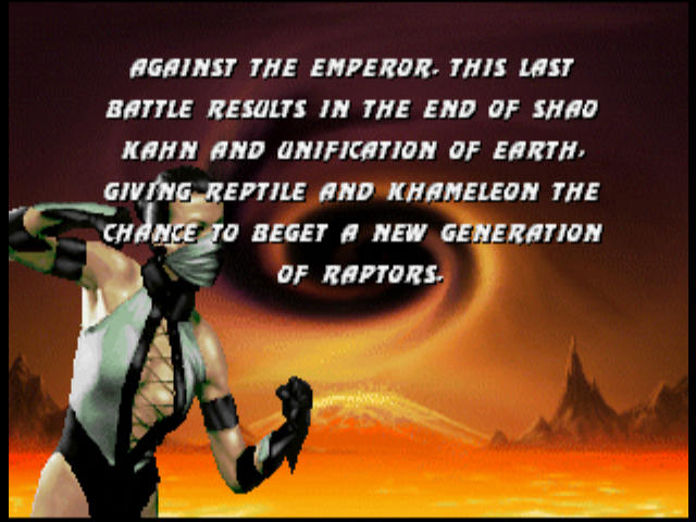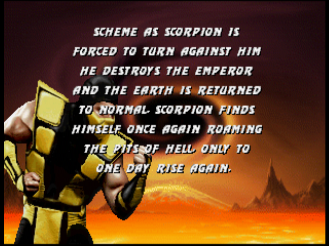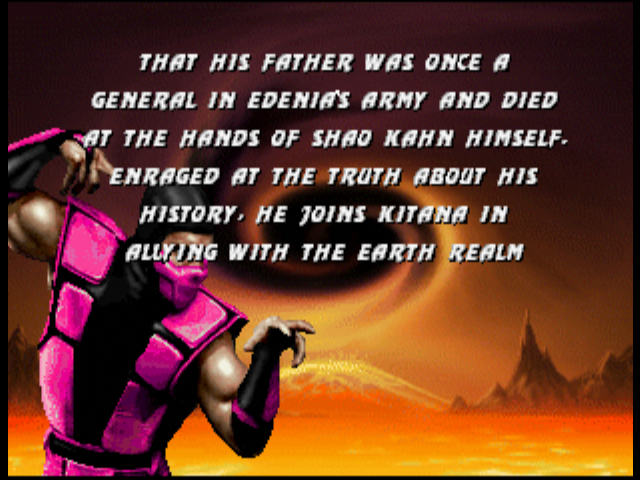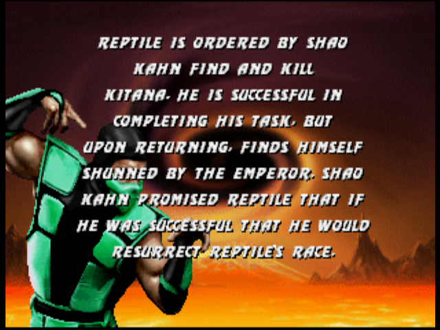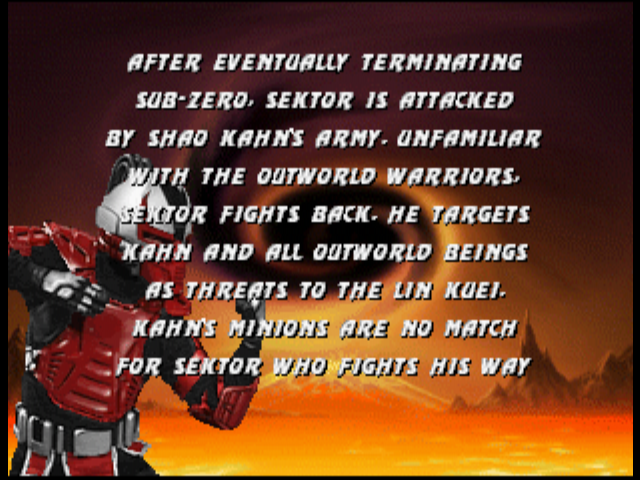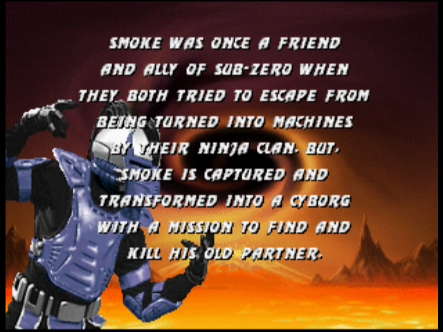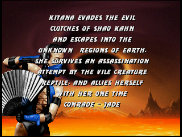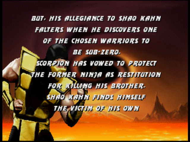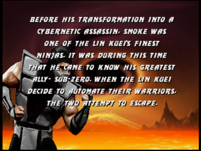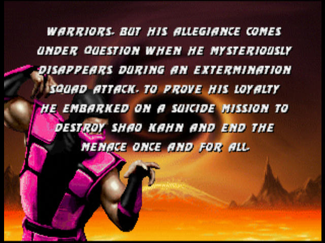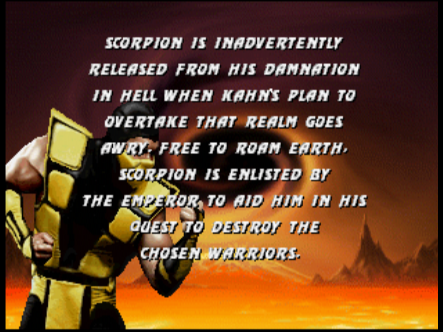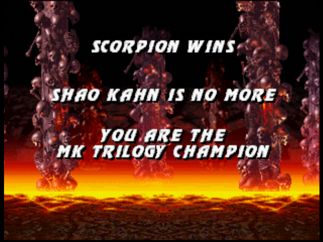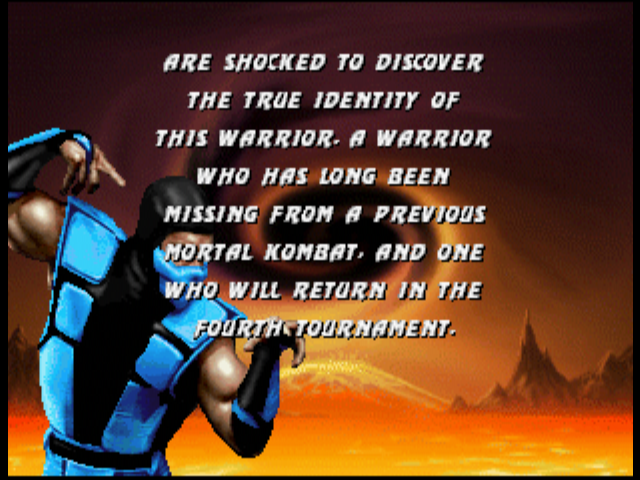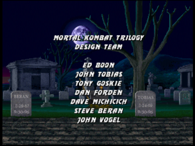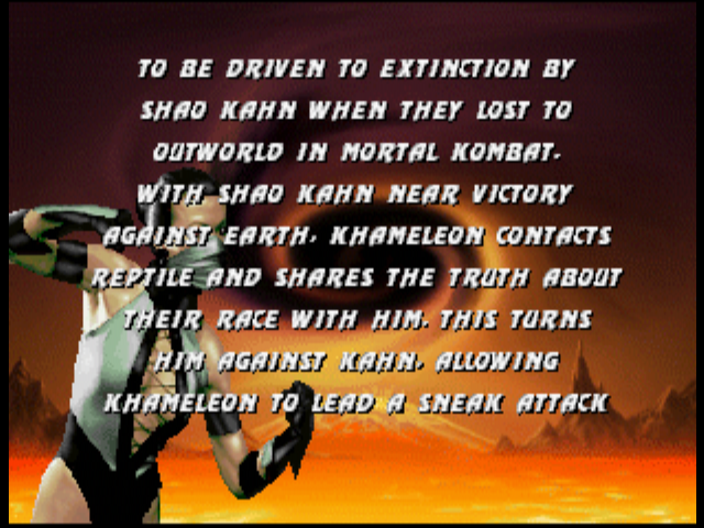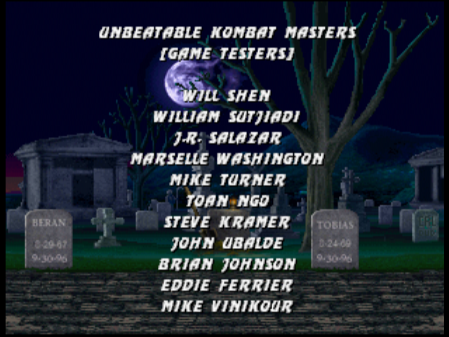 | - Scorpion - | Noob Saibot | Baraka | Johnny Cage | Sonya | Rayden | Rain | Cyrax | Smoke (Human) | Khameleon | Reptile | Jax | Sektor | | Liu Kang | Jade | Sheeva | Kung Lao | Smoke | Nightwolf | Sindel | Ermac | Sub-Zero | Stryker | Kabal | Kitana | Kano | Shang Tsung | Mileena | |