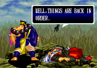 | Home | BackTweet | - Good Endings - | Bad Ending | | Haohmaru | Kazuki Kazama | Sogetsu Kazama | Galford | Jubei Yagyu | Basara Kubikiri | Shizumaru Hisame | Rimururu | Charlotte | | Genjuro Kibagami | Ukyo Tachibana | Hanzo Hattori | Kyoshiro Senryo | - Gaira Kafuin - | Nakoruru | Tam Tam | Amakusa Shirou |