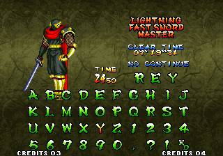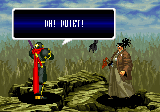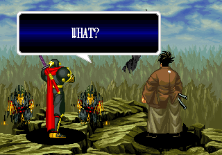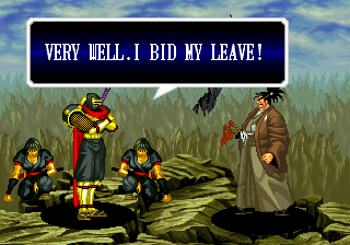 | Haohmaru | Kazuki Kazama | Sogetsu Kazama | Galford | Jubei Yagyu | Basara Kubikiri | Shizumaru Hisame | Rimururu | Charlotte | | Genjuro Kibagami | Ukyo Tachibana | - Hanzo Hattori - | Kyoshiro Senryo | Gaira Kafuin | Nakoruru | Tam Tam | Amakusa Shirou | | - Good Endings - | Bad Ending | |
