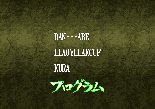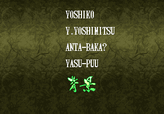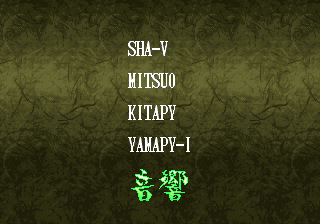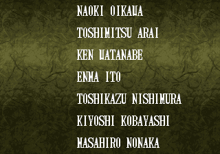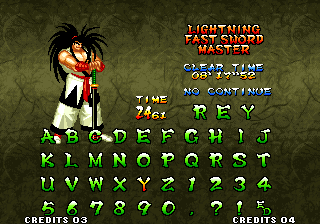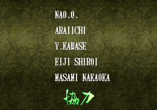 | - Haohmaru - | Kazuki Kazama | Sogetsu Kazama | Galford | Jubei Yagyu | Basara Kubikiri | Shizumaru Hisame | Rimururu | Charlotte | | Genjuro Kibagami | Ukyo Tachibana | Hanzo Hattori | Kyoshiro Senryo | Gaira Kafuin | Nakoruru | Tam Tam | Amakusa Shirou | | - Good Endings - | Bad Ending | |