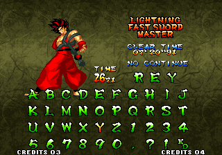 | Haohmaru | - Kazuki Kazama - | Sogetsu Kazama | Galford | Jubei Yagyu | Basara Kubikiri | Shizumaru Hisame | Rimururu | Charlotte | | Genjuro Kibagami | Ukyo Tachibana | Hanzo Hattori | Kyoshiro Senryo | Gaira Kafuin | Nakoruru | Tam Tam | Amakusa Shirou | | - Good Endings - | Bad Ending | |