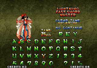 | Haohmaru | Kazuki Kazama | Sogetsu Kazama | Galford | Jubei Yagyu | Basara Kubikiri | Shizumaru Hisame | Rimururu | Charlotte | | Genjuro Kibagami | Ukyo Tachibana | Hanzo Hattori | Kyoshiro Senryo | Gaira Kafuin | - Nakoruru - | Tam Tam | Amakusa Shirou | | - Good Endings - | Bad Ending | |