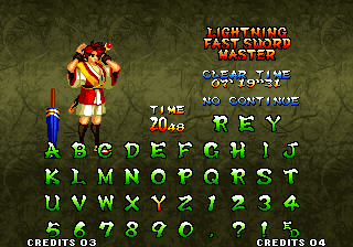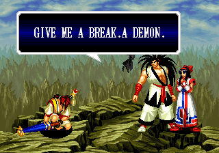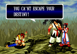 | Haohmaru | Kazuki Kazama | Sogetsu Kazama | Galford | Jubei Yagyu | Basara Kubikiri | - Shizumaru Hisame - | Rimururu | Charlotte | | Genjuro Kibagami | Ukyo Tachibana | Hanzo Hattori | Kyoshiro Senryo | Gaira Kafuin | Nakoruru | Tam Tam | Amakusa Shirou | | - Good Endings - | Bad Ending | |