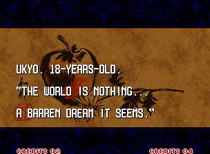 | Home | BackTweet | Haohmaru | Basara | Genjuro Kibagami | Shizumaru Hisame | Galford | Gaira Kafuin | | Kyoshiro Senryo | - Ukyo Tachibana - | Rimururu | Nakoruru | Hanzo Hattori | Amakusa Shiro |