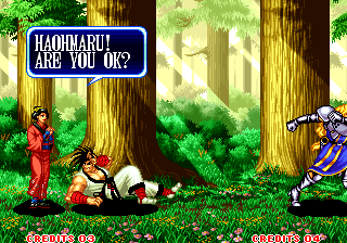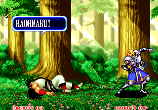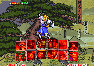 | Haohmaru | - Charlotte - | Hanzo Hattori | Genjuro Kibagami | Kyoshiro Senryo | Sieger Neinhalt | Galford | | Earthquake | Cham Cham | Ukyo Tachibana | Jubei Yagyu | Nakoruru | Gen-An Shiranui | Wan-Fu | Nicotine Caffeine | |