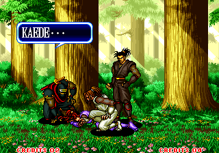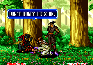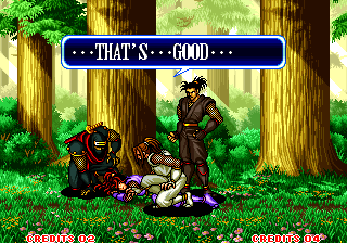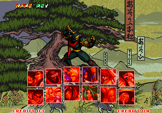 | Haohmaru | Charlotte | - Hanzo Hattori - | Genjuro Kibagami | Kyoshiro Senryo | Sieger Neinhalt | Galford | | Earthquake | Cham Cham | Ukyo Tachibana | Jubei Yagyu | Nakoruru | Gen-An Shiranui | Wan-Fu | Nicotine Caffeine | |