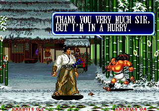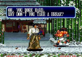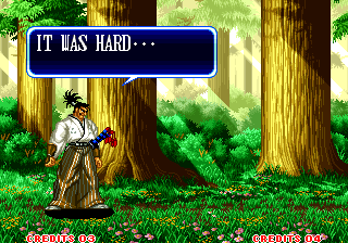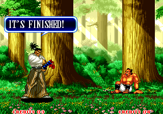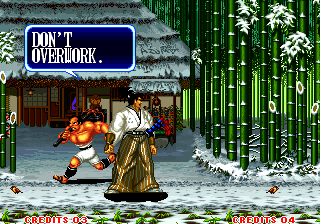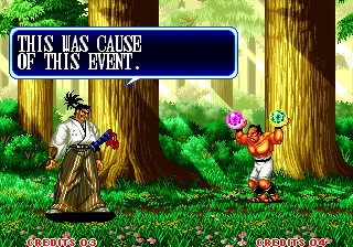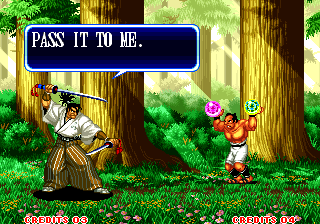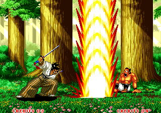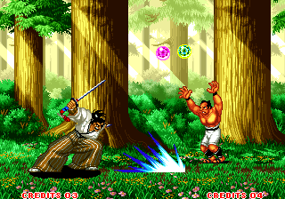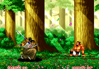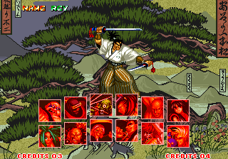 | Haohmaru | Charlotte | Hanzo Hattori | Genjuro Kibagami | Kyoshiro Senryo | Sieger Neinhalt | Galford | | Earthquake | Cham Cham | Ukyo Tachibana | - Jubei Yagyu - | Nakoruru | Gen-An Shiranui | Wan-Fu | Nicotine Caffeine | |