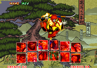 | Haohmaru | Charlotte | Hanzo Hattori | Genjuro Kibagami | - Kyoshiro Senryo - | Sieger Neinhalt | Galford | | Earthquake | Cham Cham | Ukyo Tachibana | Jubei Yagyu | Nakoruru | Gen-An Shiranui | Wan-Fu | Nicotine Caffeine | |