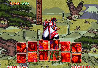 | Haohmaru | Charlotte | Hanzo Hattori | Genjuro Kibagami | Kyoshiro Senryo | Sieger Neinhalt | Galford | | Earthquake | Cham Cham | Ukyo Tachibana | Jubei Yagyu | - Nakoruru - | Gen-An Shiranui | Wan-Fu | Nicotine Caffeine | |