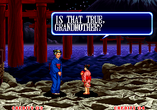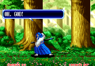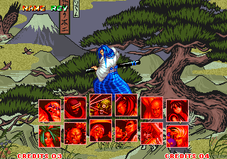 | Haohmaru | Charlotte | Hanzo Hattori | Genjuro Kibagami | Kyoshiro Senryo | Sieger Neinhalt | Galford | | Earthquake | Cham Cham | - Ukyo Tachibana - | Jubei Yagyu | Nakoruru | Gen-An Shiranui | Wan-Fu | Nicotine Caffeine | |