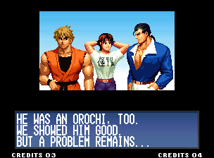 | Hero Team: Kyo, Benimaru, Daimon | Fatal Fury Team: Terry, Andy, Joe | - Art of Fighting Team: Ryo, Robert, Yuri - | Ikari Team: Ralf, Clark, Leona | | Psycho Soldier Team: Athena, Kensou, Chin | Women Fighters Team: Mai, Chizuru, King | Korea Team: Kim, Chang, Choi | | New Face Team: Yashiro, Shermie, Chris | '97 Special Team: Blue Mary, Ryuji, Billy Kane | | - Standard Teams - | Special Teams | Team Edit | |