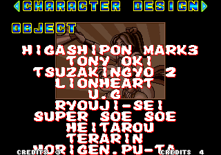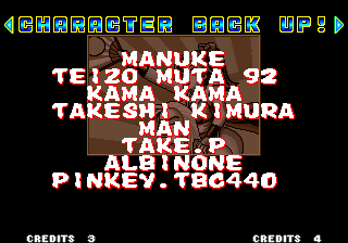 | Terry Bogard | Andy Bogard | Joe Higashi | - Mai Shiranui - | | Kim Kaphwan | Jubei Yamada | Cheng Sinzan | Big Bear | |