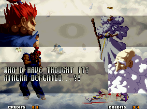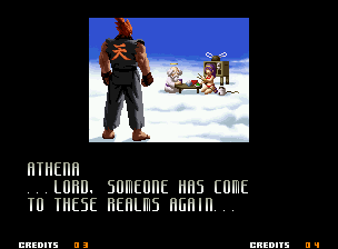 | - If The Conditions Were Met To Fight Athena - | If The Conditions Were Met To Fight Red Arremer | | Kyo | Iori | Orochi Iori | Kasumi | Kim | Ryo | Mai | Terry | Geese | Goenitz | Choi | Mars People | Genjyuro | Shiki | Earthquake | Mr.Karate | Shin Mr.Karate | | Ryu | Ken | Violent Ken | Chun-Li | Guile | Dhalsim | Tessa | Dan | Demitri | Hugo | Zero | Balrog | Vega | Sagat | M.Bison | - Akuma - | Shin Akuma | | - Good Endings - | Bad Ending | |