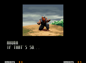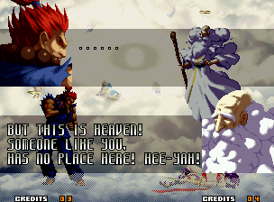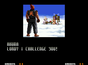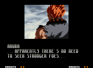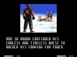 | Home | BackTweet | - Good Endings - | Bad Ending | | Kyo | Iori | Orochi Iori | Kasumi | Kim | Ryo | Mai | Terry | Geese | Goenitz | Choi | Mars People | Genjyuro | Shiki | Earthquake | Mr.Karate | Shin Mr.Karate | | Ryu | Ken | Violent Ken | Chun-Li | Guile | Dhalsim | Tessa | Dan | Demitri | Hugo | Zero | Balrog | Vega | Sagat | M.Bison | - Akuma - | Shin Akuma | | - If The Conditions Were Met To Fight Athena - | If The Conditions Were Met To Fight Red Arremer |