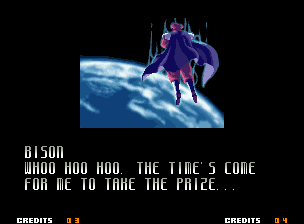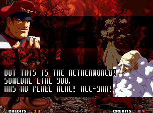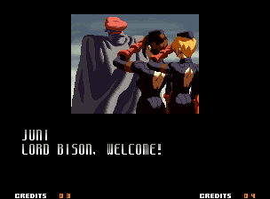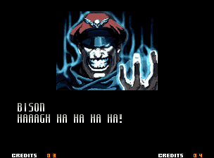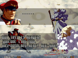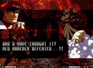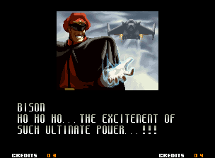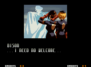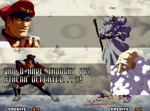 | Home | BackTweet | - Good Endings - | Bad Ending | | Kyo | Iori | Orochi Iori | Kasumi | Kim | Ryo | Mai | Terry | Geese | Goenitz | Choi | Mars People | Genjyuro | Shiki | Earthquake | Mr.Karate | Shin Mr.Karate | | Ryu | Ken | Violent Ken | Chun-Li | Guile | Dhalsim | Tessa | Dan | Demitri | Hugo | Zero | Balrog | Vega | Sagat | - M.Bison - | Akuma | Shin Akuma | If The Conditions Were Met To Fight Athena