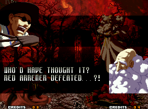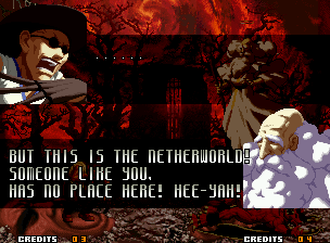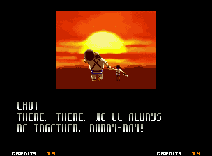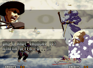 | Home | BackTweet | - Good Endings - | Bad Ending | | Kyo | Iori | Orochi Iori | Kasumi | Kim | Ryo | Mai | Terry | Geese | Goenitz | - Choi - | Mars People | Genjyuro | Shiki | Earthquake | Mr.Karate | Shin Mr.Karate | | Ryu | Ken | Violent Ken | Chun-Li | Guile | Dhalsim | Tessa | Dan | Demitri | Hugo | Zero | Balrog | Vega | Sagat | M.Bison | Akuma | Shin Akuma | If The Conditions Were Met To Fight Athena