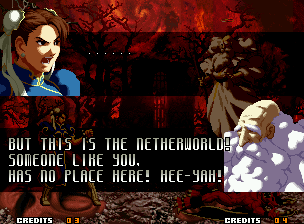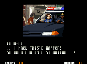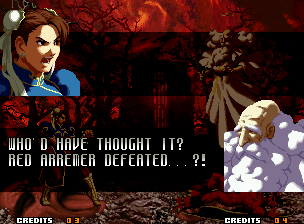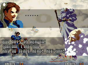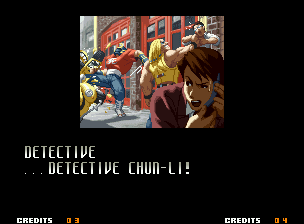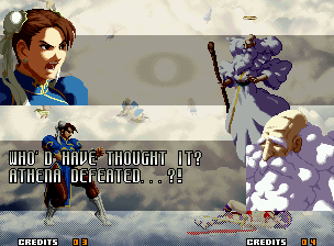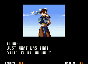 | Home | BackTweet | - Good Endings - | Bad Ending | | Kyo | Iori | Orochi Iori | Kasumi | Kim | Ryo | Mai | Terry | Geese | Goenitz | Choi | Mars People | Genjyuro | Shiki | Earthquake | Mr.Karate | Shin Mr.Karate | | Ryu | Ken | Violent Ken | - Chun-Li - | Guile | Dhalsim | Tessa | Dan | Demitri | Hugo | Zero | Balrog | Vega | Sagat | M.Bison | Akuma | Shin Akuma | If The Conditions Were Met To Fight Athena