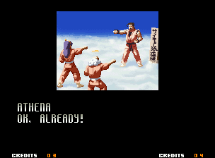 | - If The Conditions Were Met To Fight Athena - | If The Conditions Were Met To Fight Red Arremer | | Kyo | Iori | Orochi Iori | Kasumi | Kim | Ryo | Mai | Terry | Geese | Goenitz | Choi | Mars People | Genjyuro | Shiki | Earthquake | Mr.Karate | Shin Mr.Karate | | Ryu | Ken | Violent Ken | Chun-Li | Guile | Dhalsim | Tessa | - Dan - | Demitri | Hugo | Zero | Balrog | Vega | Sagat | M.Bison | Akuma | Shin Akuma | | - Good Endings - | Bad Ending | |