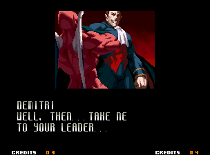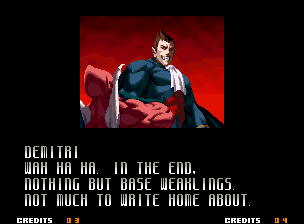 | Home | BackTweet | - Good Endings - | Bad Ending | | Kyo | Iori | Orochi Iori | Kasumi | Kim | Ryo | Mai | Terry | Geese | Goenitz | Choi | Mars People | Genjyuro | Shiki | Earthquake | Mr.Karate | Shin Mr.Karate | | Ryu | Ken | Violent Ken | Chun-Li | Guile | Dhalsim | Tessa | Dan | - Demitri - | Hugo | Zero | Balrog | Vega | Sagat | M.Bison | Akuma | Shin Akuma | | If The Conditions Were Met To Fight Athena | - If The Conditions Were Met To Fight Red Arremer - |