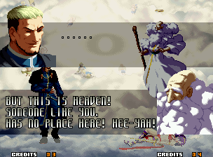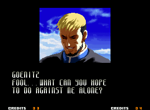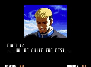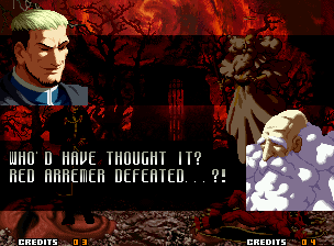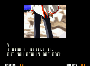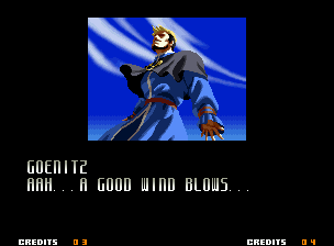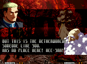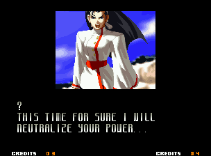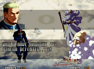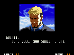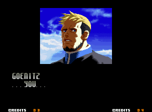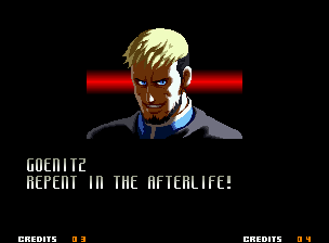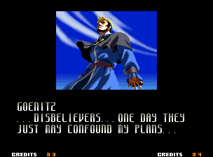 | Home | BackTweet | - Good Endings - | Bad Ending | | Kyo | Iori | Orochi Iori | Kasumi | Kim | Ryo | Mai | Terry | Geese | - Goenitz - | Choi | Mars People | Genjyuro | Shiki | Earthquake | Mr.Karate | Shin Mr.Karate | | Ryu | Ken | Violent Ken | Chun-Li | Guile | Dhalsim | Tessa | Dan | Demitri | Hugo | Zero | Balrog | Vega | Sagat | M.Bison | Akuma | Shin Akuma | If The Conditions Were Met To Fight Athena