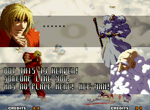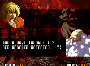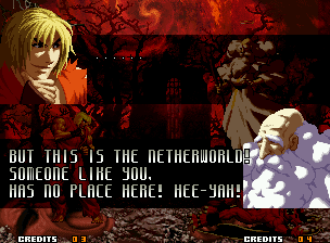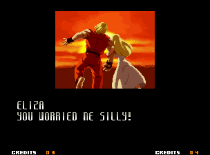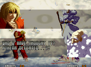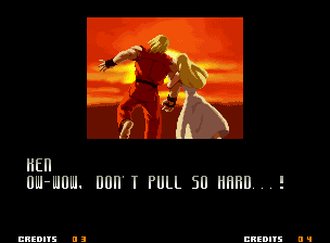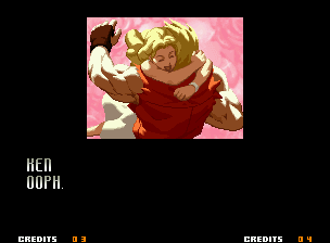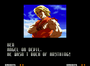 | Home | BackTweet | - Good Endings - | Bad Ending | | Kyo | Iori | Orochi Iori | Kasumi | Kim | Ryo | Mai | Terry | Geese | Goenitz | Choi | Mars People | Genjyuro | Shiki | Earthquake | Mr.Karate | Shin Mr.Karate | | Ryu | - Ken - | Violent Ken | Chun-Li | Guile | Dhalsim | Tessa | Dan | Demitri | Hugo | Zero | Balrog | Vega | Sagat | M.Bison | Akuma | Shin Akuma | If The Conditions Were Met To Fight Athena