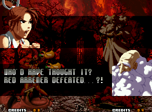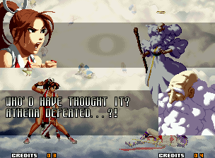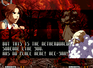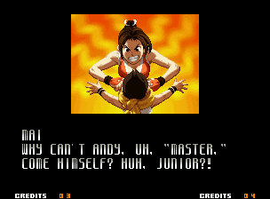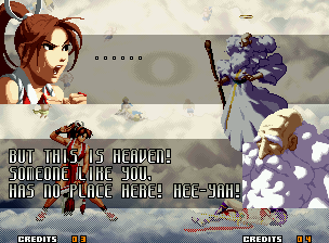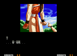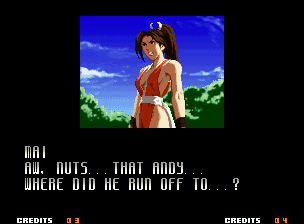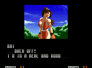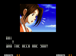 | Home | BackTweet | - Good Endings - | Bad Ending | | Kyo | Iori | Orochi Iori | Kasumi | Kim | Ryo | - Mai - | Terry | Geese | Goenitz | Choi | Mars People | Genjyuro | Shiki | Earthquake | Mr.Karate | Shin Mr.Karate | | Ryu | Ken | Violent Ken | Chun-Li | Guile | Dhalsim | Tessa | Dan | Demitri | Hugo | Zero | Balrog | Vega | Sagat | M.Bison | Akuma | Shin Akuma | If The Conditions Were Met To Fight Athena