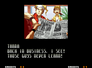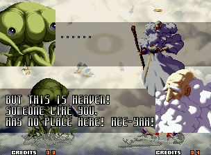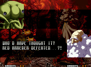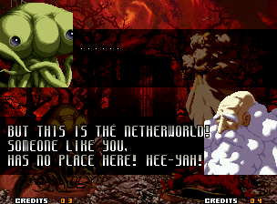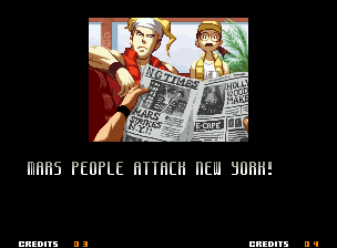 | Home | BackTweet | - Good Endings - | Bad Ending | | Kyo | Iori | Orochi Iori | Kasumi | Kim | Ryo | Mai | Terry | Geese | Goenitz | Choi | - Mars People - | Genjyuro | Shiki | Earthquake | Mr.Karate | Shin Mr.Karate | | Ryu | Ken | Violent Ken | Chun-Li | Guile | Dhalsim | Tessa | Dan | Demitri | Hugo | Zero | Balrog | Vega | Sagat | M.Bison | Akuma | Shin Akuma | If The Conditions Were Met To Fight Athena