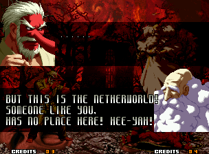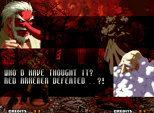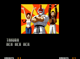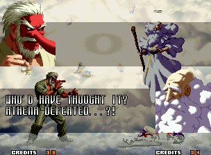 | Home | BackTweet | - Good Endings - | Bad Ending | | Kyo | Iori | Orochi Iori | Kasumi | Kim | Ryo | Mai | Terry | Geese | Goenitz | Choi | Mars People | Genjyuro | Shiki | Earthquake | - Mr.Karate - | Shin Mr.Karate | | Ryu | Ken | Violent Ken | Chun-Li | Guile | Dhalsim | Tessa | Dan | Demitri | Hugo | Zero | Balrog | Vega | Sagat | M.Bison | Akuma | Shin Akuma | If The Conditions Were Met To Fight Athena