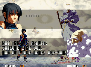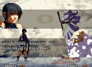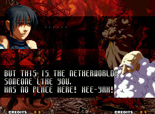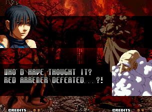 | Home | BackTweet | - Good Endings - | Bad Ending | | Kyo | Iori | Orochi Iori | Kasumi | Kim | Ryo | Mai | Terry | Geese | Goenitz | Choi | Mars People | Genjyuro | - Shiki - | Earthquake | Mr.Karate | Shin Mr.Karate | | Ryu | Ken | Violent Ken | Chun-Li | Guile | Dhalsim | Tessa | Dan | Demitri | Hugo | Zero | Balrog | Vega | Sagat | M.Bison | Akuma | Shin Akuma | If The Conditions Were Met To Fight Athena