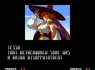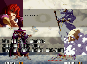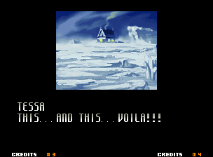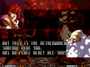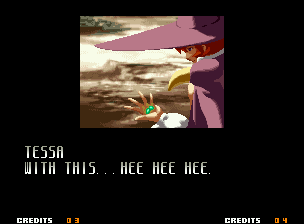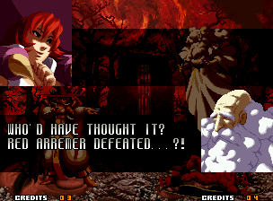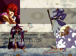 | Home | BackTweet | - Good Endings - | Bad Ending | | Kyo | Iori | Orochi Iori | Kasumi | Kim | Ryo | Mai | Terry | Geese | Goenitz | Choi | Mars People | Genjyuro | Shiki | Earthquake | Mr.Karate | Shin Mr.Karate | | Ryu | Ken | Violent Ken | Chun-Li | Guile | Dhalsim | - Tessa - | Dan | Demitri | Hugo | Zero | Balrog | Vega | Sagat | M.Bison | Akuma | Shin Akuma | If The Conditions Were Met To Fight Athena
