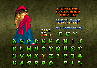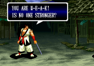 | Haohmaru | Kazuki Kazama | Sogetsu Kazama | Galford | Jubei Yagyu | Basara Kubikiri | Shizumaru Hisame | Rimururu | Charlotte | | - Genjuro Kibagami - | Ukyo Tachibara | Hanzo Hattori | Kyoshiro Senryo | Gaira Kafuin | Nakoruru | Tam Tam | Amakusa Shirou | | - Good Endings - | Bad Ending | |