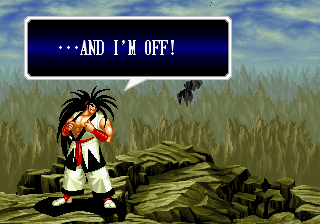 | Home | BackTweet | - Good Endings - | Bad Ending | | - Haohmaru - | Kazuki Kazama | Sogetsu Kazama | Galford | Jubei Yagyu | Basara Kubikiri | Shizumaru Hisame | Rimururu | Charlotte | | Genjuro Kibagami | Ukyo Tachibara | Hanzo Hattori | Kyoshiro Senryo | Gaira Kafuin | Nakoruru | Tam Tam | Amakusa Shirou |