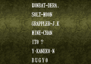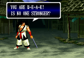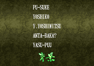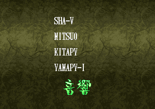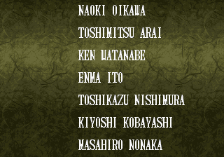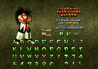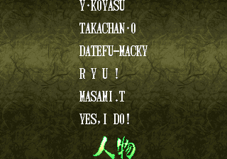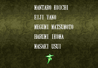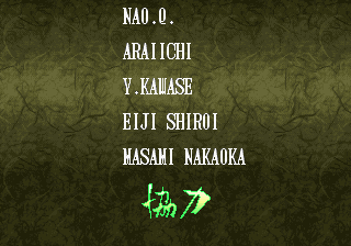 | - Haohmaru - | Kazuki Kazama | Sogetsu Kazama | Galford | Jubei Yagyu | Basara Kubikiri | Shizumaru Hisame | Rimururu | Charlotte | | Genjuro Kibagami | Ukyo Tachibara | Hanzo Hattori | Kyoshiro Senryo | Gaira Kafuin | Nakoruru | Tam Tam | Amakusa Shirou | | - Good Endings - | Bad Ending | |