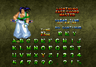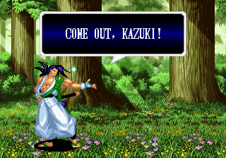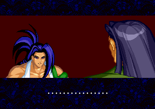 | Haohmaru | Kazuki Kazama | - Sogetsu Kazama - | Galford | Jubei Yagyu | Basara Kubikiri | Shizumaru Hisame | Rimururu | Charlotte | | Genjuro Kibagami | Ukyo Tachibara | Hanzo Hattori | Kyoshiro Senryo | Gaira Kafuin | Nakoruru | Tam Tam | Amakusa Shirou | | - Good Endings - | Bad Ending | |
