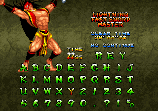 | Haohmaru | Kazuki Kazama | Sogetsu Kazama | Galford | Jubei Yagyu | Basara Kubikiri | Shizumaru Hisame | Rimururu | Charlotte | | Genjuro Kibagami | Ukyo Tachibara | Hanzo Hattori | Kyoshiro Senryo | Gaira Kafuin | Nakoruru | - Tam Tam - | Amakusa Shirou | | - Good Endings - | Bad Ending | |