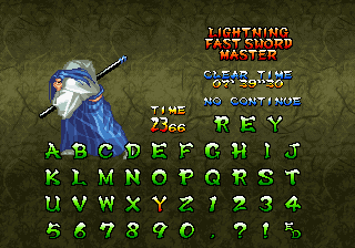 | Haohmaru | Kazuki Kazama | Sogetsu Kazama | Galford | Jubei Yagyu | Basara Kubikiri | Shizumaru Hisame | Rimururu | Charlotte | | Genjuro Kibagami | - Ukyo Tachibara - | Hanzo Hattori | Kyoshiro Senryo | Gaira Kafuin | Nakoruru | Tam Tam | Amakusa Shirou | | - Good Endings - | Bad Ending | |