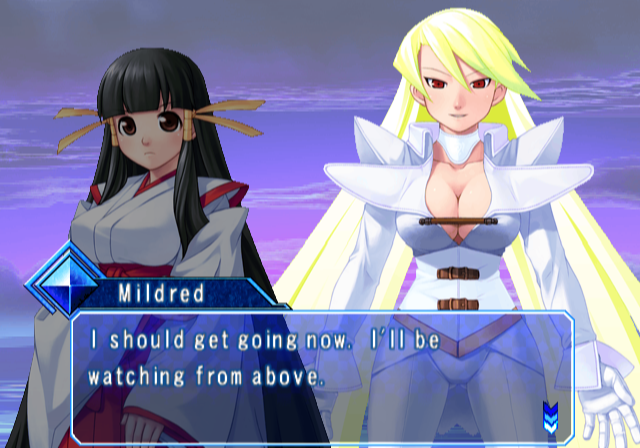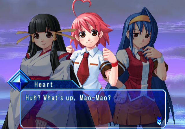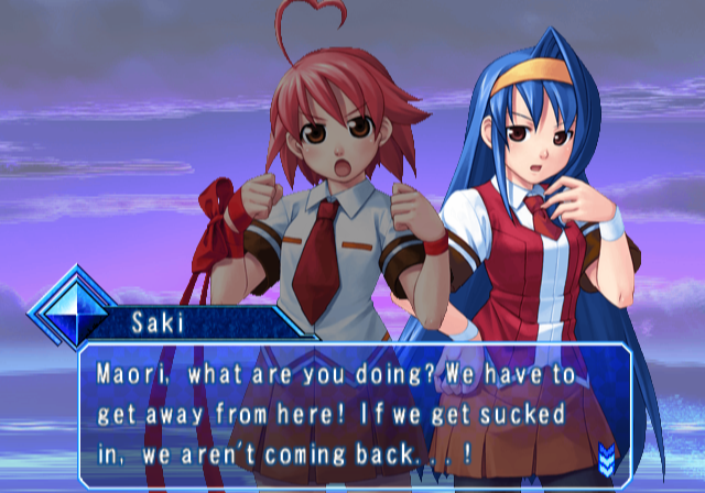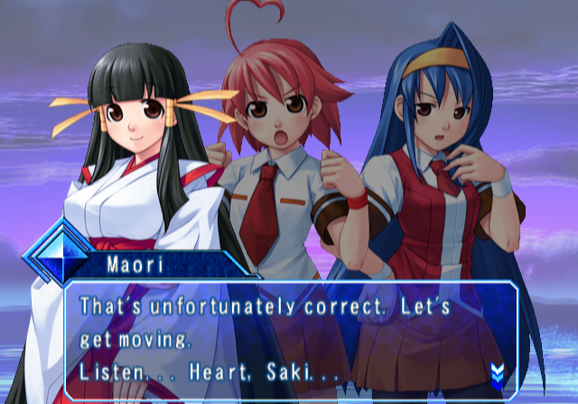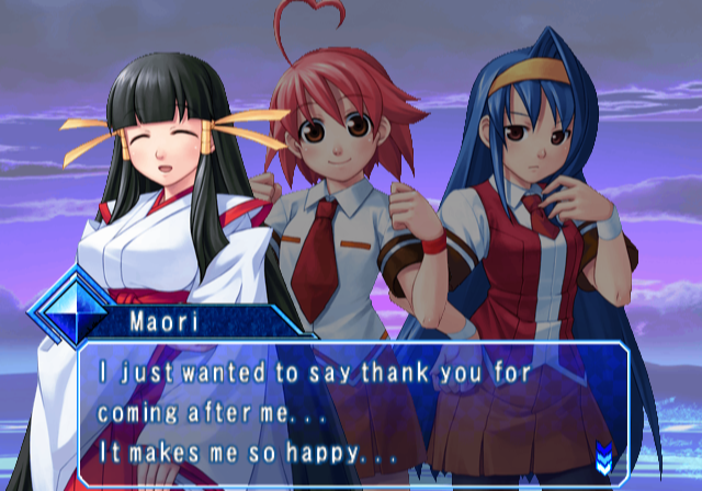 | Fiona Mayfield | Heart Aino | Kamui Tokinomiya | Kira Daidohji | Konoha | Lieselotte Achenbach | Lilica Felchenerow | - Maori Kasuga - | Mei-Fang | Saki Tsuzura | Yoriko Yasuzumi | | Good Ending | - Bad Ending - | | - Story Mode - | Arcade Mode | |