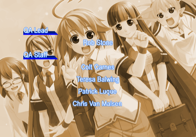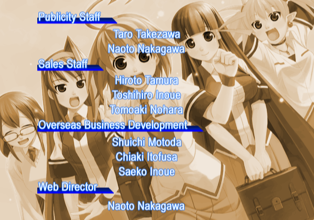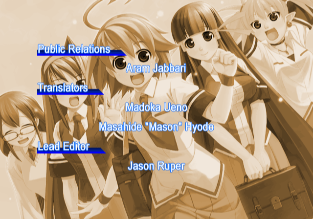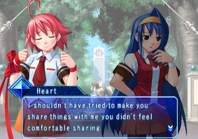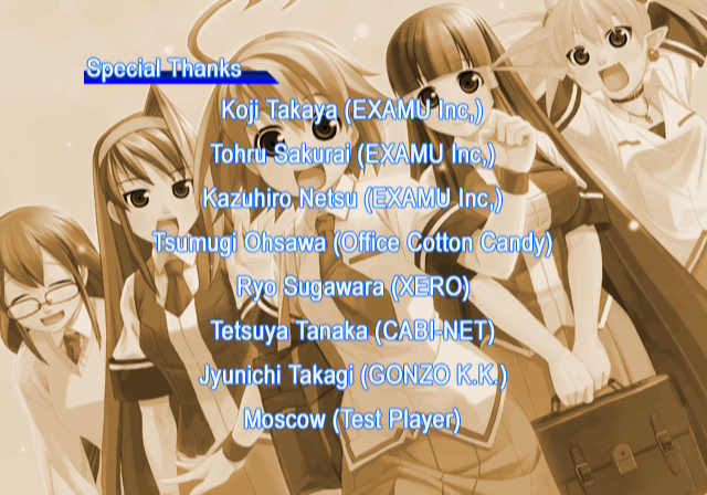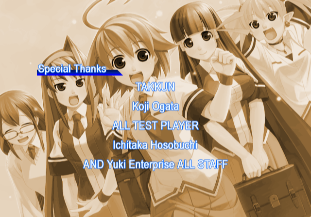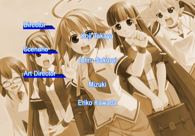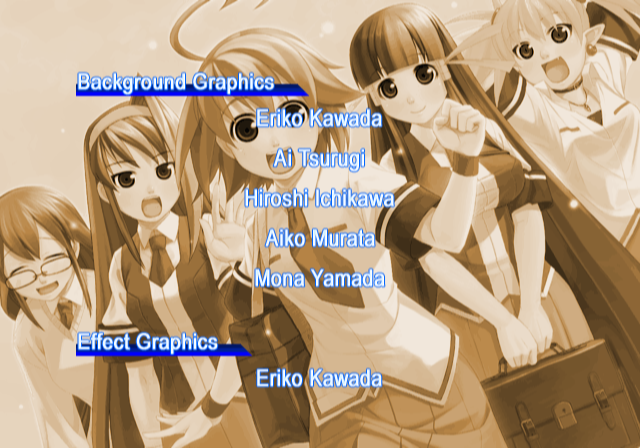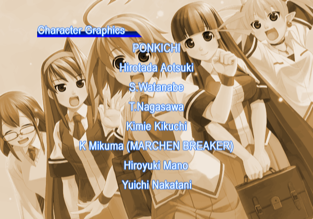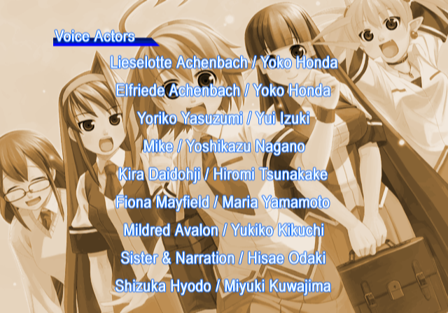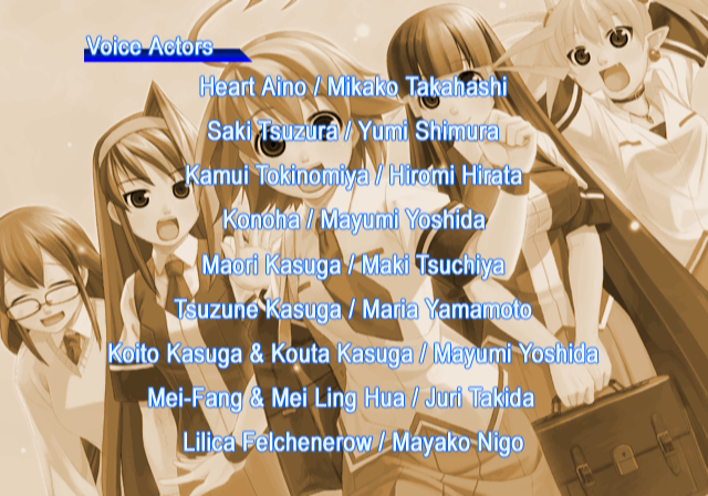 | Fiona Mayfield | - Heart Aino - | Kamui Tokinomiya | Kira Daidohji | Konoha | Lieselotte Achenbach | Lilica Felchenerow | Maori Kasuga | Mei-Fang | Saki Tsuzura | Yoriko Yasuzumi | | - Good Ending - | Bad Ending | | - Story Mode - | Arcade Mode | |