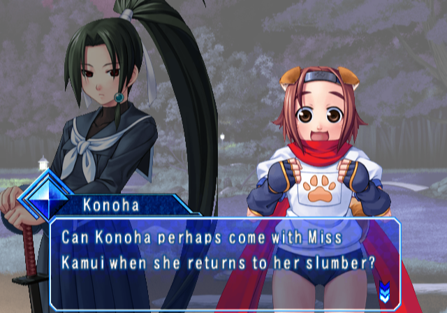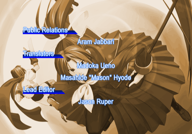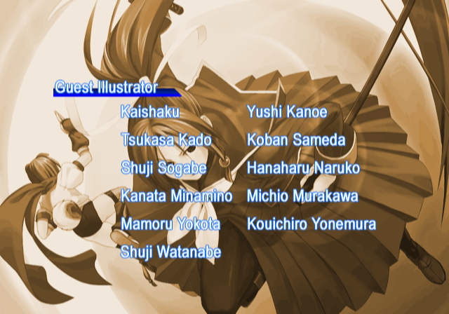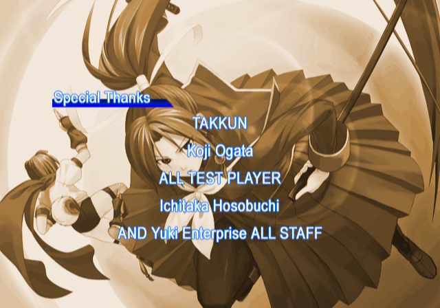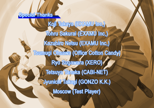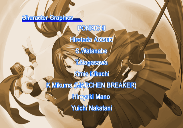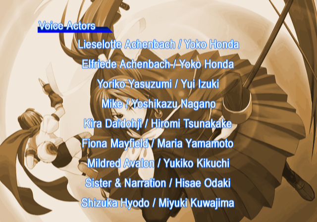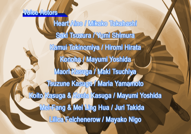 | Fiona Mayfield | Heart Aino | - Kamui Tokinomiya - | Kira Daidohji | Konoha | Lieselotte Achenbach | Lilica Felchenerow | Maori Kasuga | Mei-Fang | Saki Tsuzura | Yoriko Yasuzumi | | - Good Ending - | Bad Ending | | - Story Mode - | Arcade Mode | |