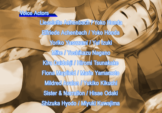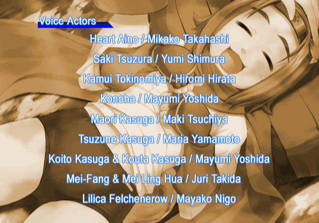 | Fiona Mayfield | Heart Aino | Kamui Tokinomiya | Kira Daidohji | - Konoha - | Lieselotte Achenbach | Lilica Felchenerow | Maori Kasuga | Mei-Fang | Saki Tsuzura | Yoriko Yasuzumi | | - Good Ending - | Bad Ending | | - Story Mode - | Arcade Mode | |