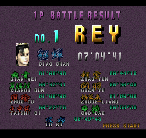 | Zhao Yun | Cao Cao | Dian Wei | - Diao Chan - | Guan Yu | Lu Bu | Lu Xun | Nobunaga | | Sun Shang Xiang | Taishi Ci | Toukichi | Xiahou Dun | Xu Zhu | Zhang Fei | Zhou Yu | Zhuge Liang | |
