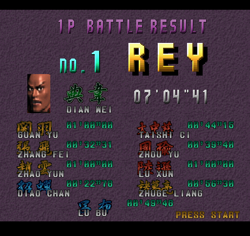 | Zhao Yun | Cao Cao | - Dian Wei - | Diao Chan | Guan Yu | Lu Bu | Lu Xun | Nobunaga | | Sun Shang Xiang | Taishi Ci | Toukichi | Xiahou Dun | Xu Zhu | Zhang Fei | Zhou Yu | Zhuge Liang | |