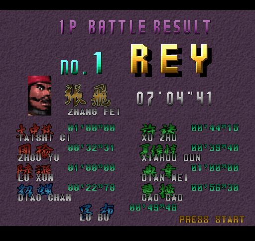 | Zhao Yun | Cao Cao | Dian Wei | Diao Chan | Guan Yu | Lu Bu | Lu Xun | Nobunaga | | Sun Shang Xiang | Taishi Ci | Toukichi | Xiahou Dun | Xu Zhu | - Zhang Fei - | Zhou Yu | Zhuge Liang | |