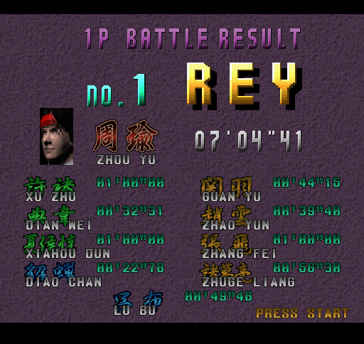 | Zhao Yun | Cao Cao | Dian Wei | Diao Chan | Guan Yu | Lu Bu | Lu Xun | Nobunaga | | Sun Shang Xiang | Taishi Ci | Toukichi | Xiahou Dun | Xu Zhu | Zhang Fei | - Zhou Yu - | Zhuge Liang | |