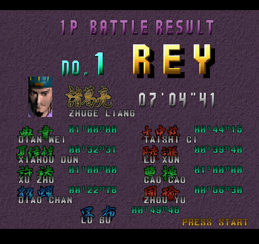 | Zhao Yun | Cao Cao | Dian Wei | Diao Chan | Guan Yu | Lu Bu | Lu Xun | Nobunaga | | Sun Shang Xiang | Taishi Ci | Toukichi | Xiahou Dun | Xu Zhu | Zhang Fei | Zhou Yu | - Zhuge Liang - | |