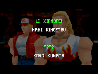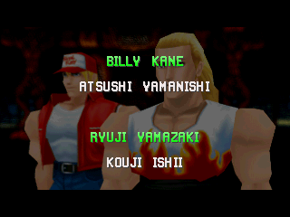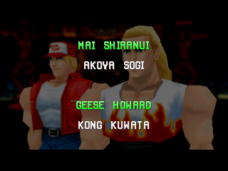 | Terry B. | - Andy B. - | Billy Kane | Duck King | Geese H. | Joe Higashi | Kim K. | | Li Xiangfei | Mai S. | Mr. Karate | R. Yamazaki | Raiden | Toji S. | Tsugumi S. | | - If Geese Was The Last Boss - | If Mr. Karate Was The Last Boss | |