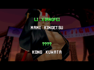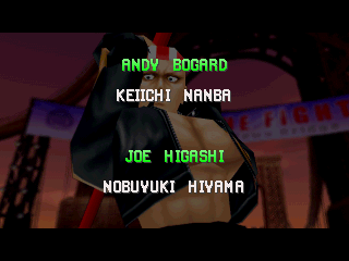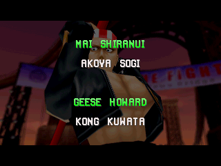 | Terry B. | Andy B. | - Billy Kane - | Duck King | Geese H. | Joe Higashi | Kim K. | | Li Xiangfei | Mai S. | Mr. Karate | R. Yamazaki | Raiden | Toji S. | Tsugumi S. | | - If Geese Was The Last Boss - | If Mr. Karate Was The Last Boss | |