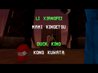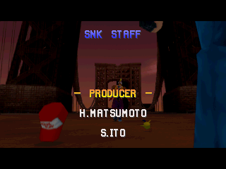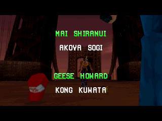 | Terry B. | Andy B. | Billy Kane | - Duck King - | Geese H. | Joe Higashi | Kim K. | | Li Xiangfei | Mai S. | Mr. Karate | R. Yamazaki | Raiden | Toji S. | Tsugumi S. | | - If Geese Was The Last Boss - | If Mr. Karate Was The Last Boss | |