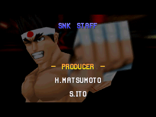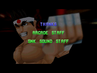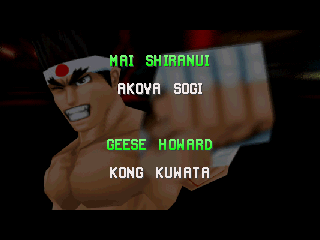 | Terry B. | Andy B. | Billy Kane | Duck King | Geese H. | - Joe Higashi - | Kim K. | | Li Xiangfei | Mai S. | Mr. Karate | R. Yamazaki | Raiden | Toji S. | Tsugumi S. | | - If Geese Was The Last Boss - | If Mr. Karate Was The Last Boss | |