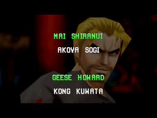 | Terry B. | Andy B. | Billy Kane | Duck King | Geese H. | Joe Higashi | Kim K. | | Li Xiangfei | Mai S. | - Mr. Karate - | R. Yamazaki | Raiden | Toji S. | Tsugumi S. | | - If Geese Was The Last Boss - | If Mr. Karate Was The Last Boss | |